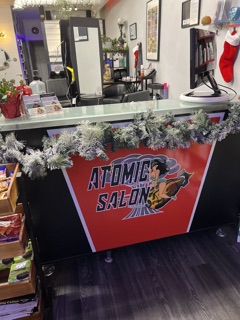 Atomic Salon offers amenities such as Appointments Only, Outdoor Parking, Parking Lot, Good for Kids, Free Wi-Fi, Gender-Neutral Restrooms, Accepts Credit Cards, ensuring a comfortable and convenient experience for clients.